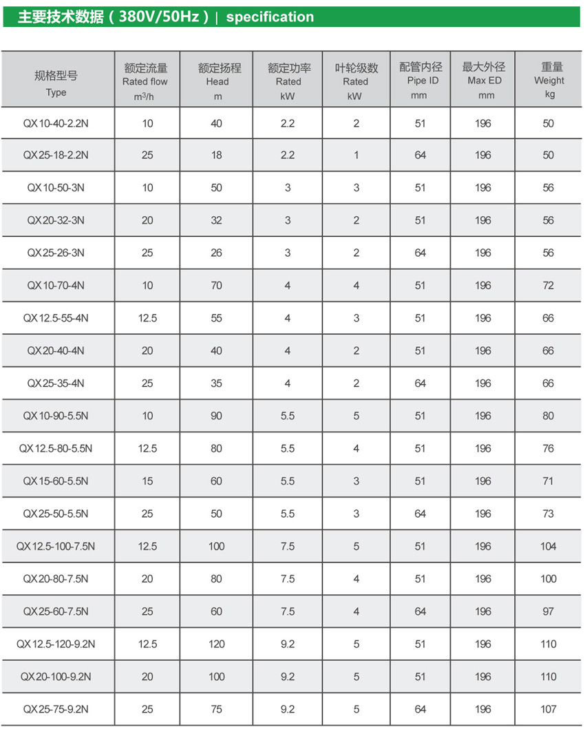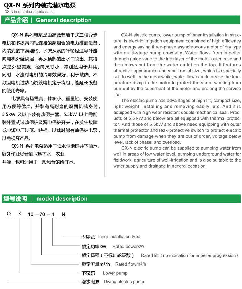 QX-N系列内装式潜水电泵是高效节能干式三相异步电动机和多级离心式水泵同轴联结的泵机合一的电力排灌机械。内装式下泵结构,水泵与电机之间采用两道独立的硬质耐磨的双面机械密封,各固定止口采用耐油橡胶“0”型圈作静密封;水流从泵叶轮经导叶流向电动机机座与外壳之间隔层,再从顶部出水口流出,对电机有良好的冷却作用,因此电泵上不可以露出水面工作,甚至可将水抽干。电泵转轴经镀铬处理,不易磨损、腐蚀,且便于叶轮的维修拆卸;电机采用B级绝缘,5.5KW及以下配有保护装置,缺相、过载、电机过热等异常情况下,断开电源保护电机;可靠的电缆防水入口即使电缆破损或线头浸入水中,水也不会进入电机,更不会因环境潮湿水汽通过电缆导线间隙吸入电机,造成绝缘下降。